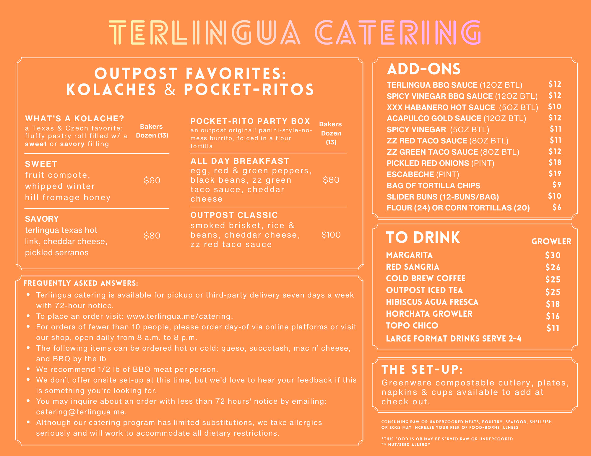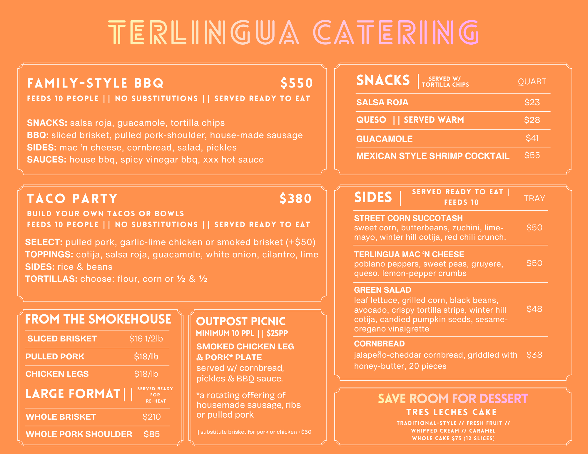 Catering orders must be placed through our online site via the link below. Please note that catering orders require 72 hours' notice. For orders needed sooner, please use our takeout menu or visit us at The Outpost, open seven days a week. For questions, email us at catering@terlingua.me or call 207-230-6327
